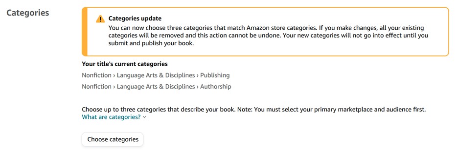 - Further down you will see a field for Categories. It will show you some current categories your book is listed in, though perhaps not all of them. (Mine was listed in more categories than I saw in KDP.) There is a disclaimer showing that once you make changes to your categories, your book will be removed from existing categories.