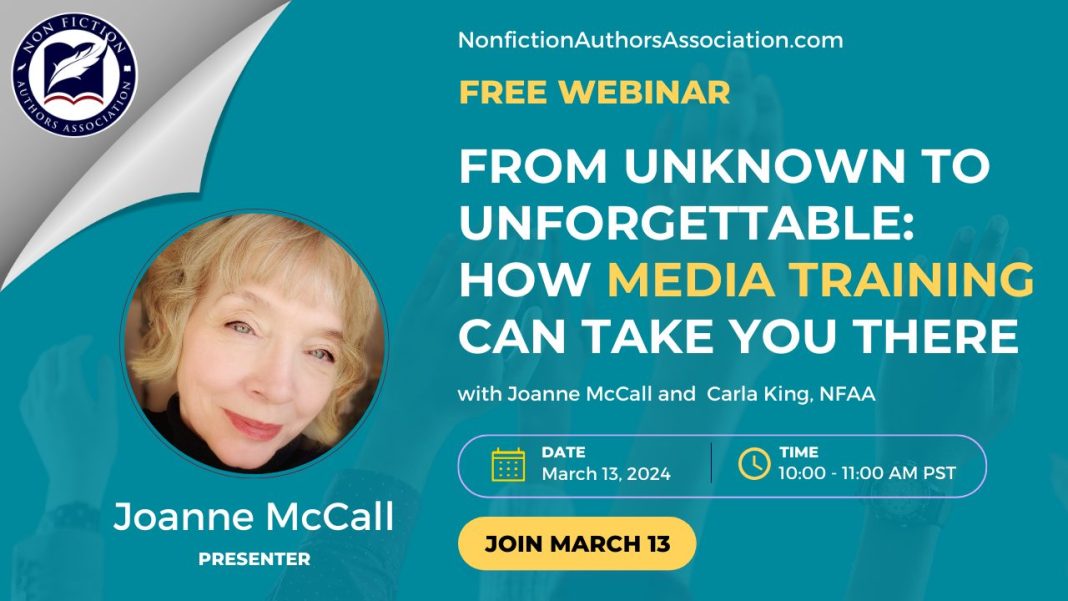 Come join us for another complimentary webinar event! Whether you’ve completed the challenging process of writing a book, or you’re still in the process of doing so, this is your opportunity to benefit from Joanne McCall’s years of experience in helping authors become Media Darlings. Every piece of advice, strategy, and tip is tailored specifically for authors, addressing the unique challenges and opportunities you face. Learn from expert guidance so that you can shine from every interview and avoid learning the hard way. This webinar is specifically designed for aspiring and established authors looking to boost their media presence. Secure your spot today and take the first step towards becoming a Media Darling, which means the media calls you! Join Joanne McCall and a community of like-minded authors ready to transform their media interactions. Don’t miss this chance to make your mark and ensure your voice is heard far and wide. See you there!